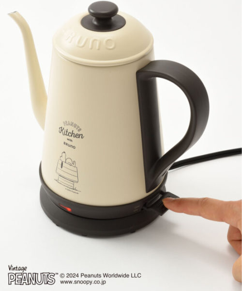 BRUNO×PEANUTSコラボのステンレスデイリーケトルは、落ち着いたエクリュカラーとスヌーピーの可愛いデザインが特徴。