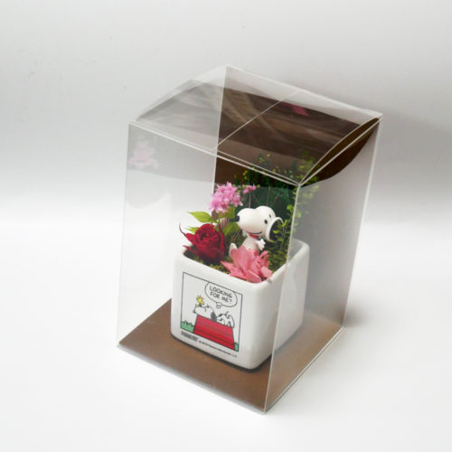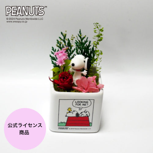 お花が一杯の森の中でニコニコのスヌーピーが可愛いナチュラル感いっぱいのアレンジメント。