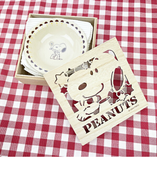 木のぬくもりとスヌーピーの可愛らしさを楽しめる《スヌーピー 木箱入フルーツ皿セット》。