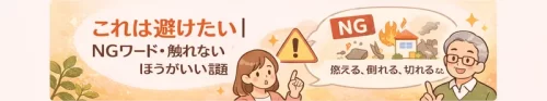 - NGワード:燃える・焼ける・火の手・倒れる・崩れる・落ちる・切れる(縁起の悪い連想)
