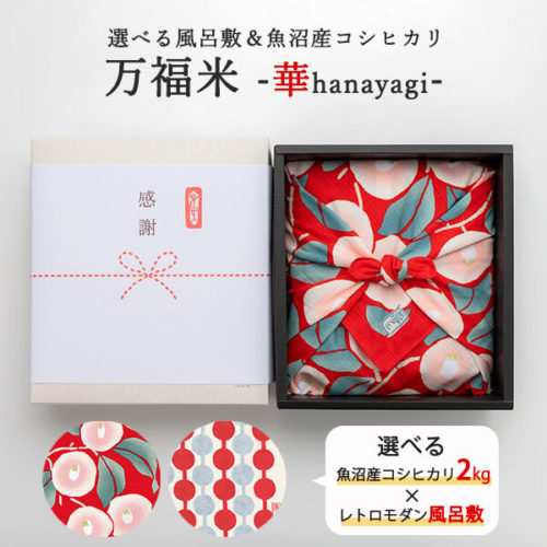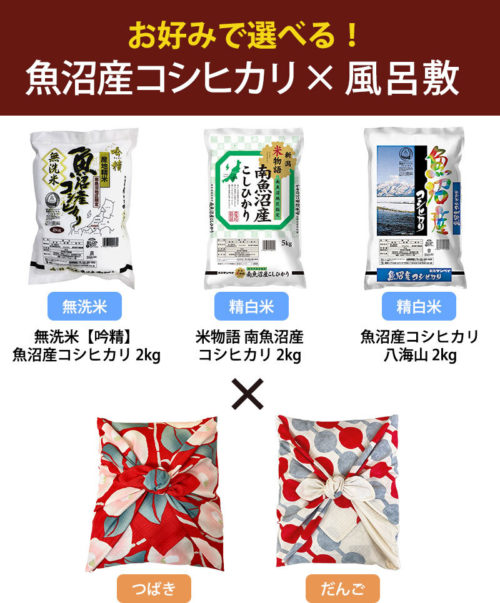 3種類のお米の中からお好きな魚沼産コシヒカリ2kgを1つ、2種類の可愛い風呂敷から1枚を選んでいただき、お好きな組み合わせで贈り物を作ることができます。